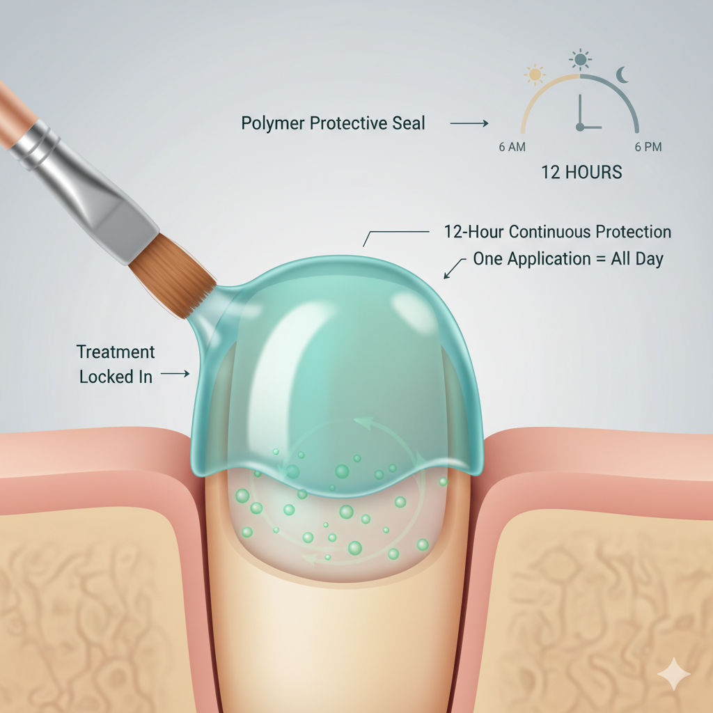 Creates a seal that locks treatment inside all day. One application = 12 hours of continuous fungal elimination. Your nails stay protected 24/7.