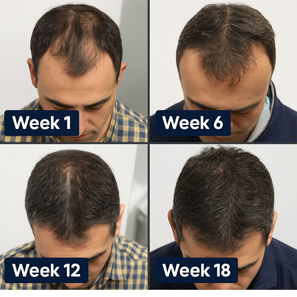 Weeks 6-8: Initial sprouting. Fine new hairs emerge in thin zones. Improved retention.