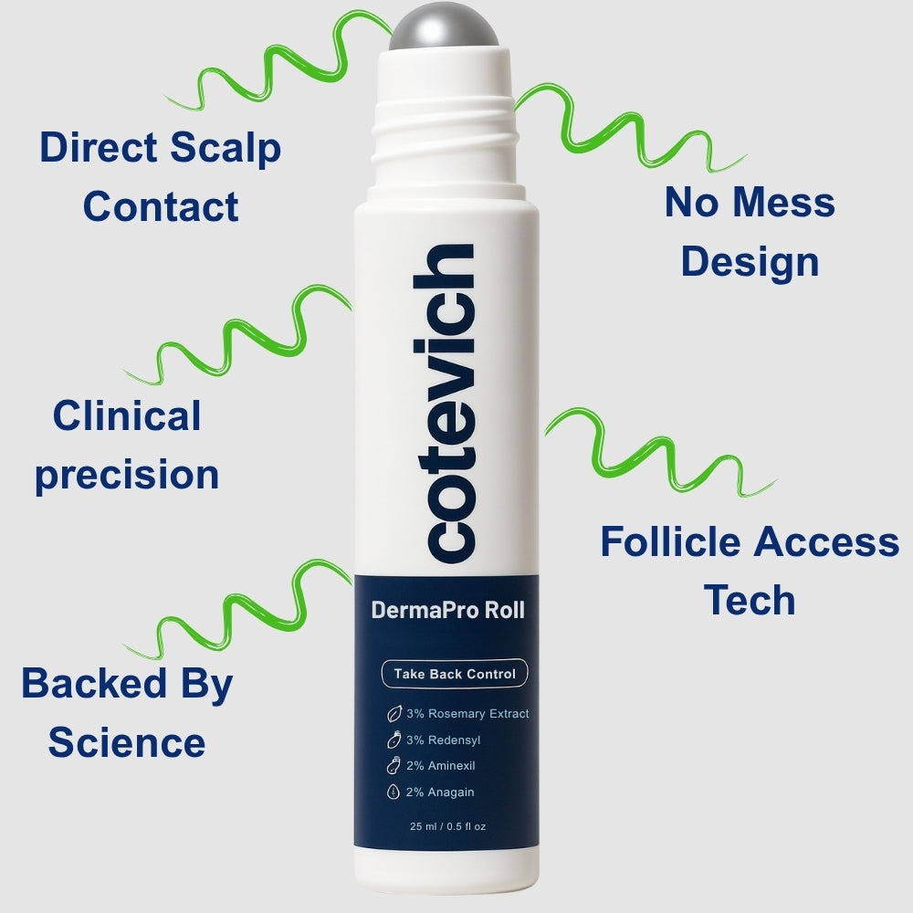 DermaPro Roll uses four researched actives Redensyl®, Aminexil™, Rosemary, and Anagain™ precisely dosed to support early thinning where it starts: at the root.