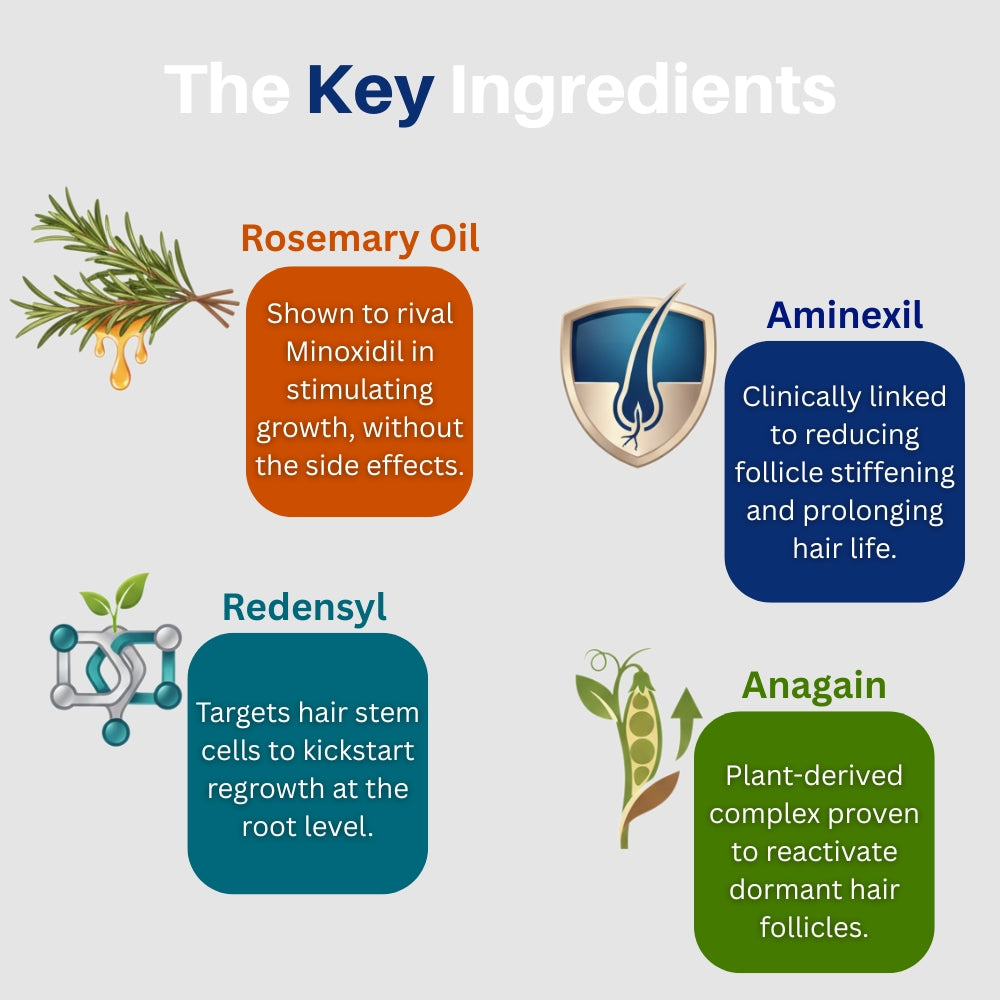 No drugs, no gimmicks. Cotevich uses precisely dosed botanicals Redensyl®, Rosemary, Aminexil, and Anagain™ ingredients backed by research, not side effects.