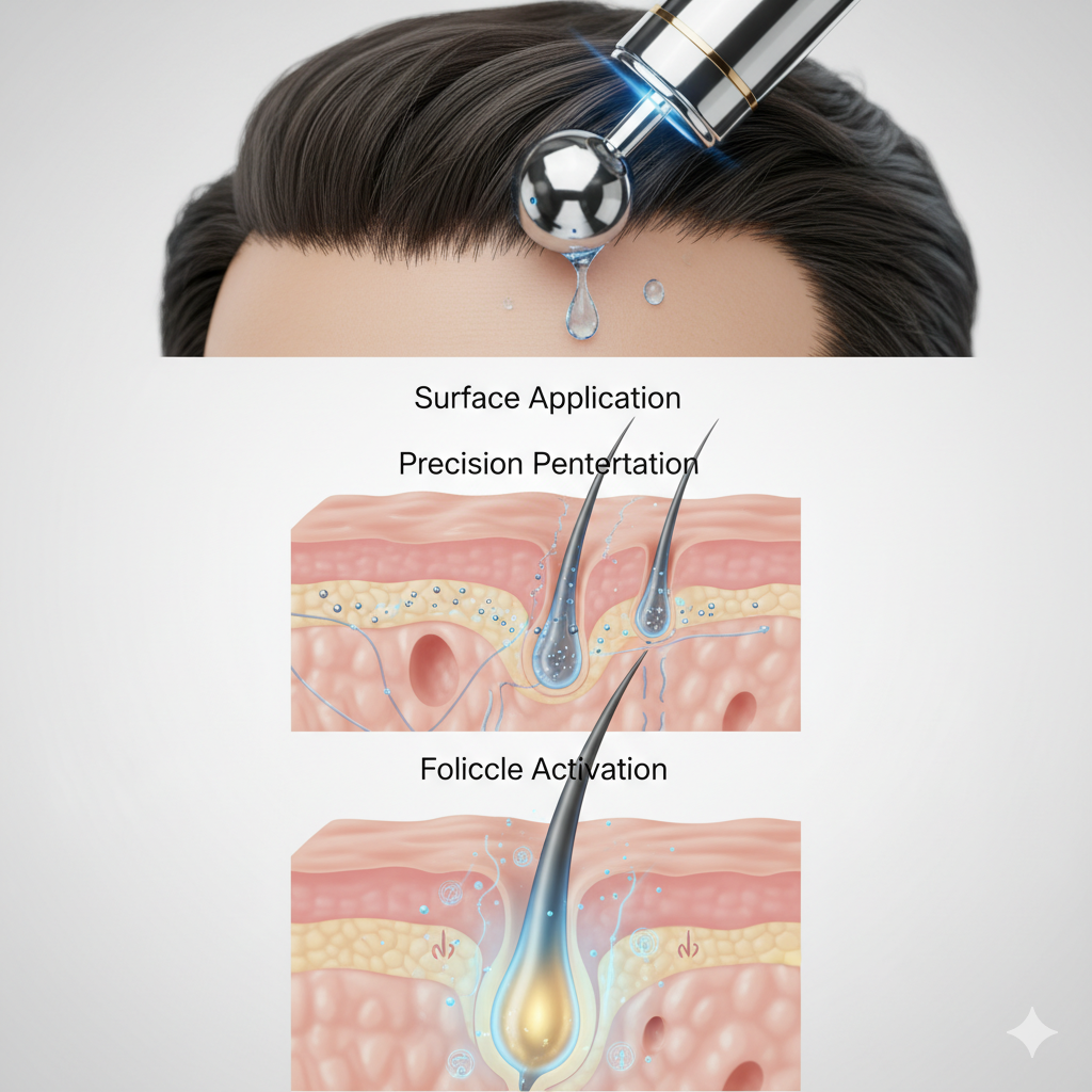 The science: Hair cuticles have microscopic ridges creating hundreds of times more surface area than scalp pores. Keratin bonds form instantly when liquid touches hair. This is why 90% of men quit treatments within 90 days - ingredients never reach follicles.