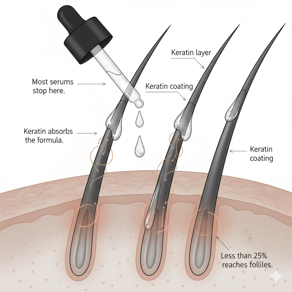 Serums, oils, minoxidil: Absorbed by hair before reaching scalp. Same keratin trap, different bottles.