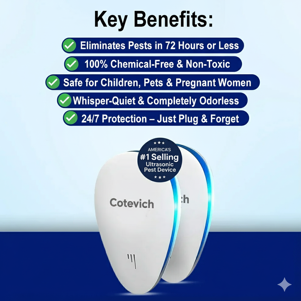 Cotevich is the top choice for families. Using Variable Wave Technology, our device cycles through 127 frequencies, creating an environment where pests can't adapt. Our technology is undetectable to humans and pets but unbearable for pests, driving them out quickly and permanently.