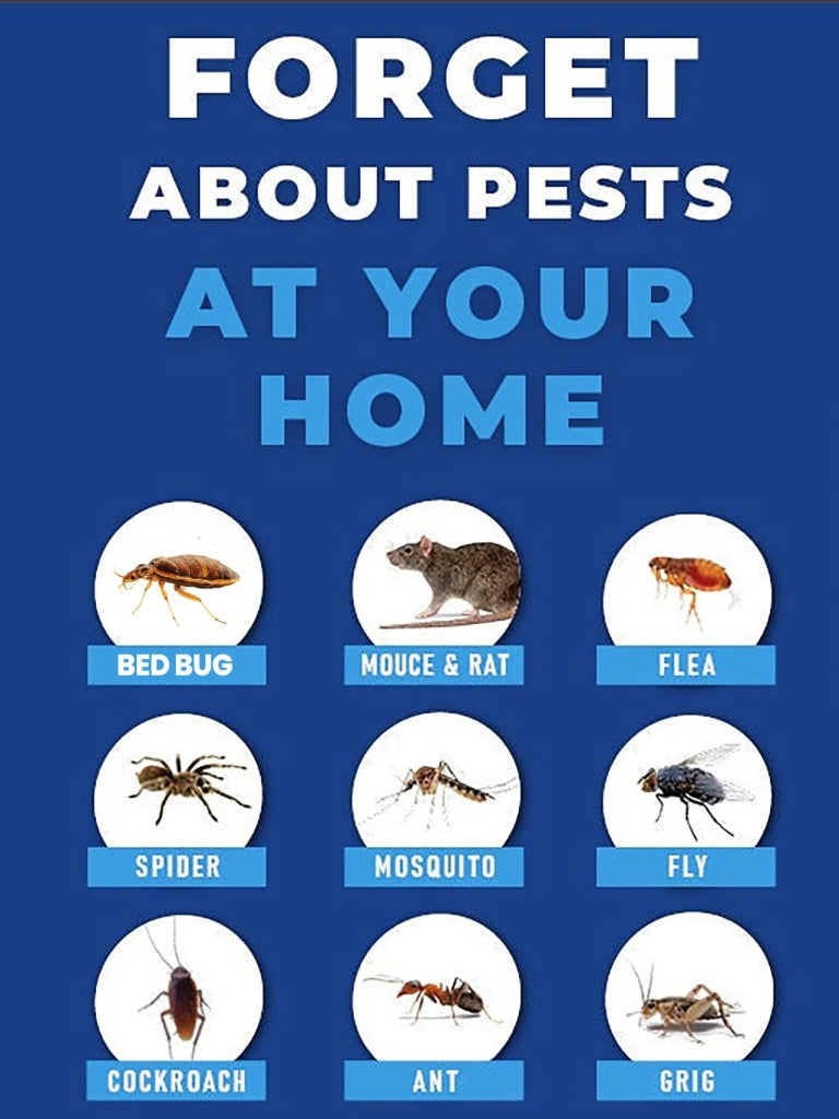 - Insects: Roaches, ants, spiders, crickets, silverfish, Bed bugs, earwigs